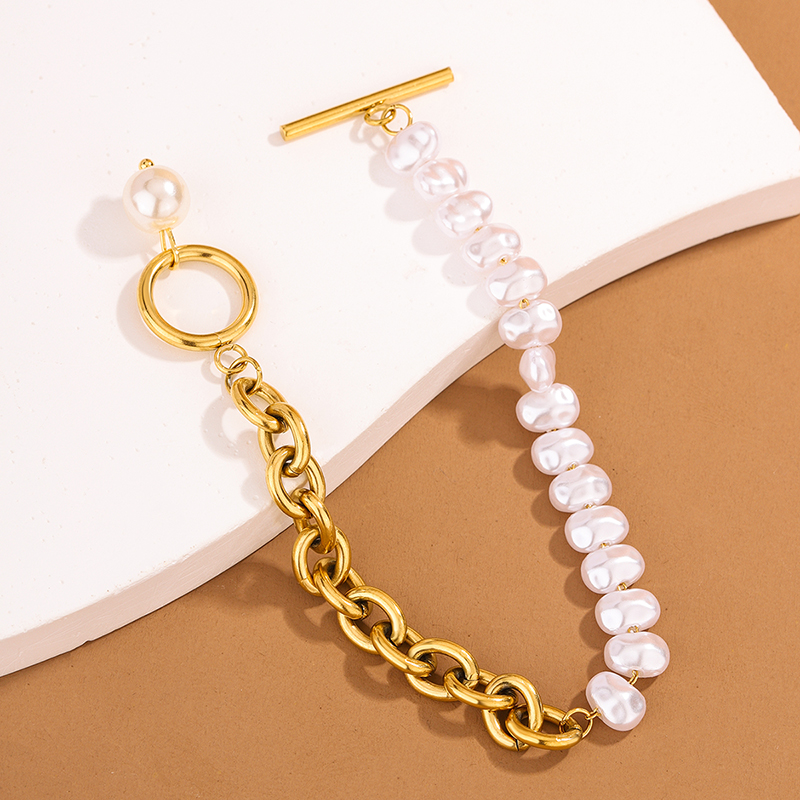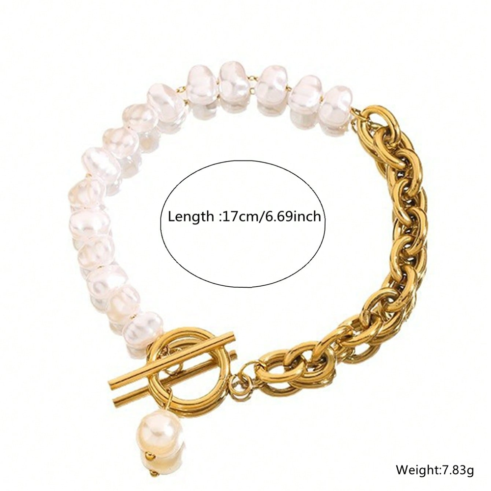 Add a touch of elegance to your style with this 18K Gold Plated Geometric Stainless Steel & Pearl Toggle Bracelet for women. Featuring a modern geometric design and delicate pearl beads, this bracelet is crafted from high-quality 304 stainless steel with durable ion plating to prevent tarnish and ensure long-lasting shine. The waterproof, lightweight design makes it ideal for family gatherings, daily wear, or parties. Finished with a secure toggle clasp, it’s a versatile accessory that pairs beautifully with any outfit, making it a perfect gift or a stylish addition to your jewelry collection.