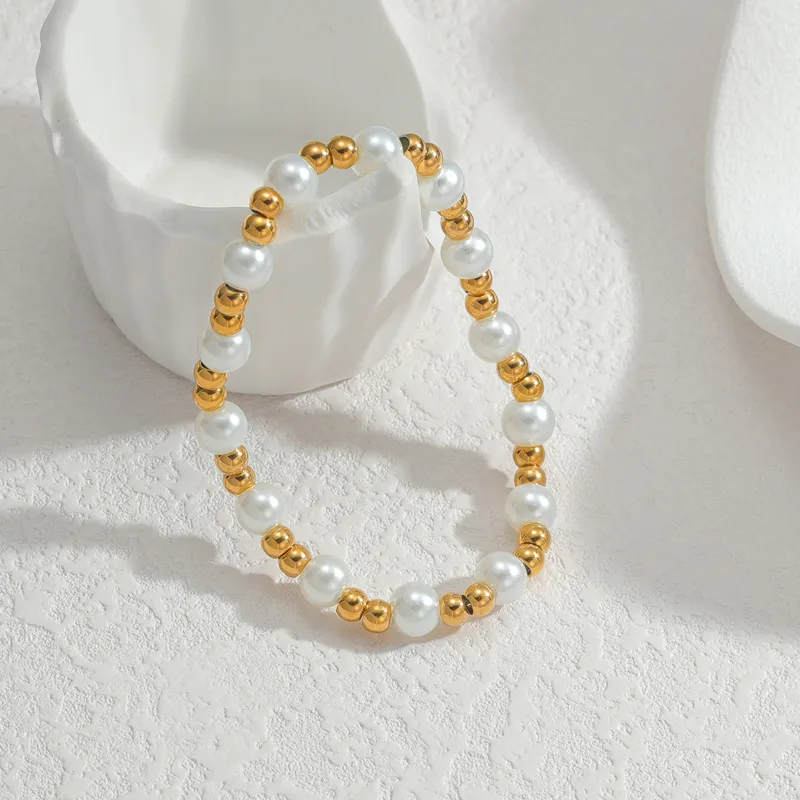 Add a touch of elegance to your style with this Gold Geometric Pearl Bead Bracelet, featuring alternating artificial pearls and gold-plated stainless steel beads. Crafted from durable 304 stainless steel and finished with real 18K gold plating using a PVD process, this bracelet is waterproof, non-tarnish, and perfect for banquets, daily wear, or street style. Lightweight and comfortable, it’s a chic accessory for any occasion or a thoughtful gift. Material: 304 stainless steel, artificial pearls, 18K gold plated (PVD coated). Style: Elegant, cute, geometric. Gender: Women’s. Weight: 10g. Diameter: 4.5cm.