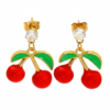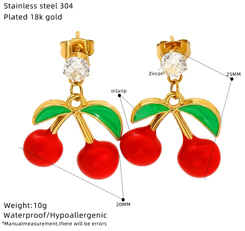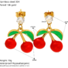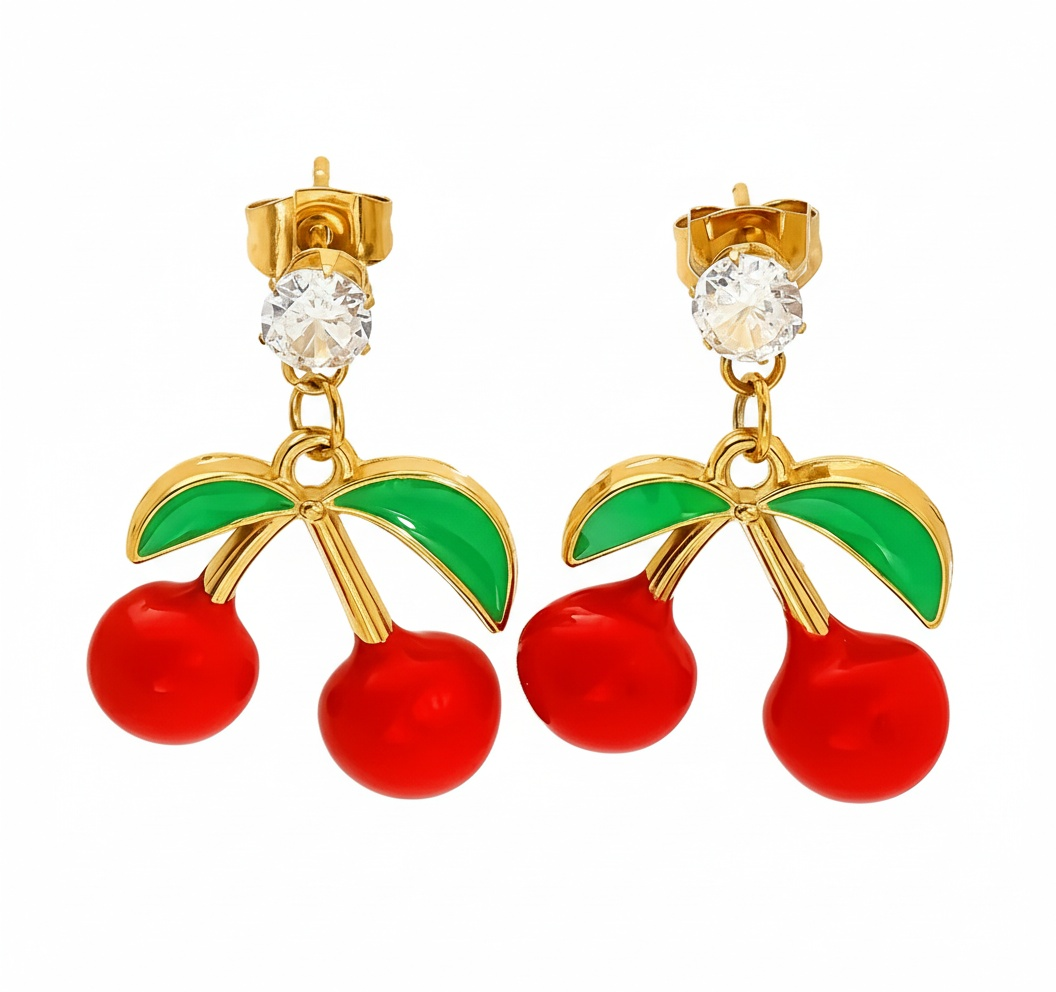 Add a playful pop of color to your look with these gold-plated cherry drop earrings. Each earring features bright red cherry charms, green enamel leaves, and a sparkling clear stone at the top. Made from polished stainless steel and finished with 18K gold plating, these earrings are lightweight, hypoallergenic, and perfect for dates, parties, or any day you want to stand out.
