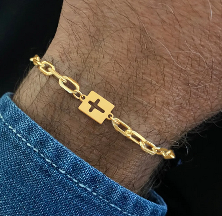 This men’s cross bracelet features a modern paperclip chain and a sleek cross pendant, crafted from high-quality 201 and 304 stainless steel. With real gold plating using a PVD coating process, it’s designed to be waterproof and resistant to tarnishing, so it keeps its shine through daily wear and all seasons. The simple, stylish look makes it a versatile accessory for holidays, casual outings, or special occasions. Lightweight and comfortable, this bracelet is ideal for anyone who wants a mix of faith, fashion, and durability in their jewelry.
