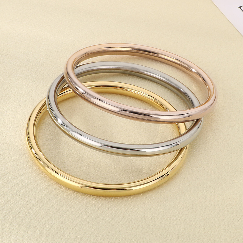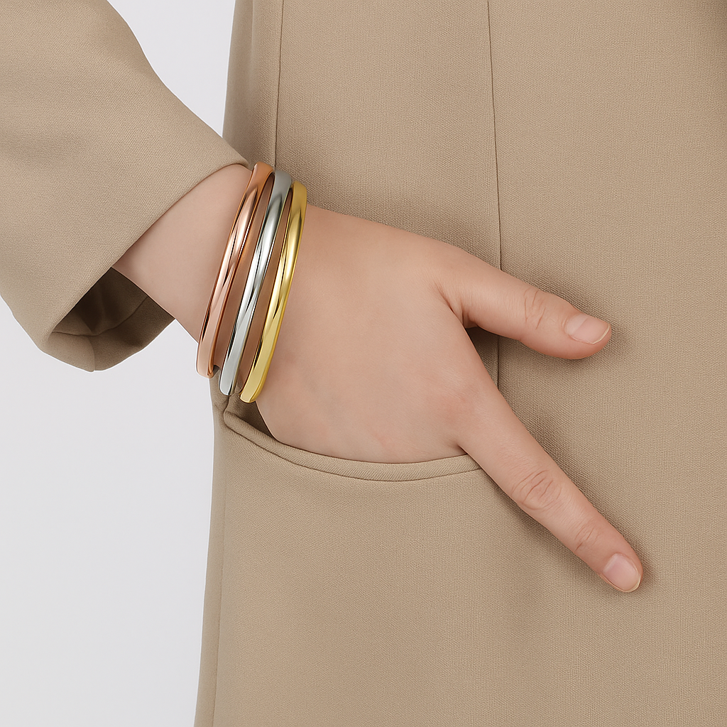 Elevate your style with this trio bangle set, featuring three sleek bangles in gold, silver, and rose gold stainless steel. Crafted from high-quality 304 stainless steel with a polished, waterproof, and tarnish-resistant finish, these bangles are designed for daily wear and effortless stacking. Mix and match the colors for a modern, on-trend look or wear them individually for a touch of subtle elegance. Hypoallergenic and durable, this set is a must-have for anyone who loves versatile, everyday jewelry.