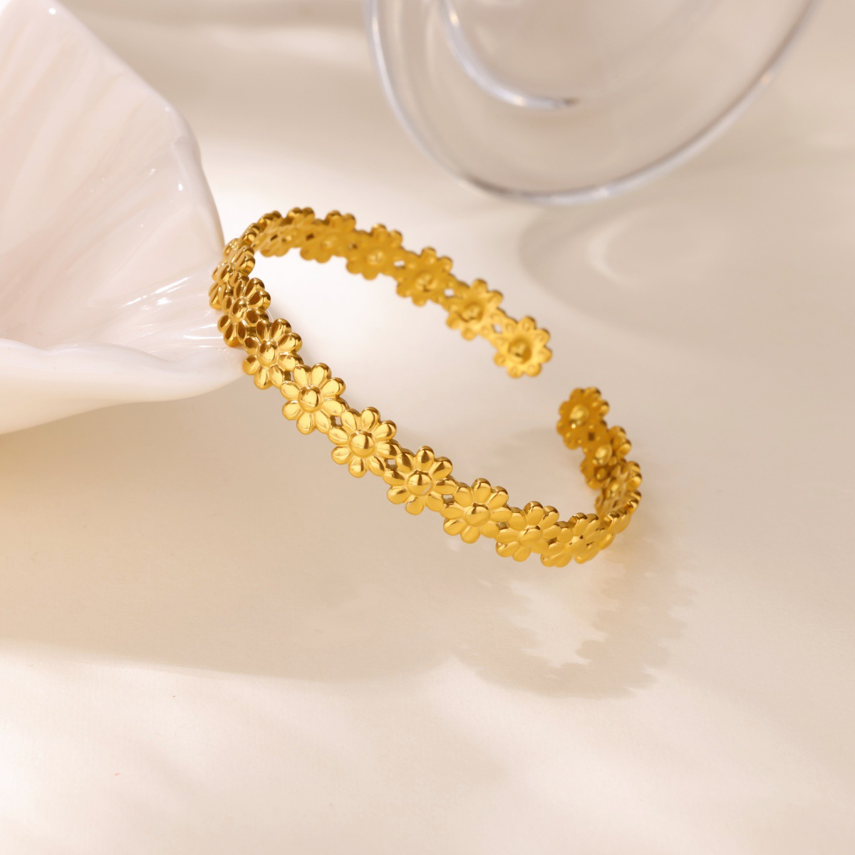Bring a touch of nature to your outfit with this beautiful floral bangle, crafted from high-quality 304 stainless steel and finished in your choice of radiant 18K gold plating or sleek silver. The detailed flower pattern adds a feminine and modern feel, making it perfect for summer, weekends, or elevating your everyday look. The comfortable slip-on design makes it easy to wear all day, whether you’re dressing up or keeping it casual. Ideal for women who love elegant, standout accessories in both classic finishes.
